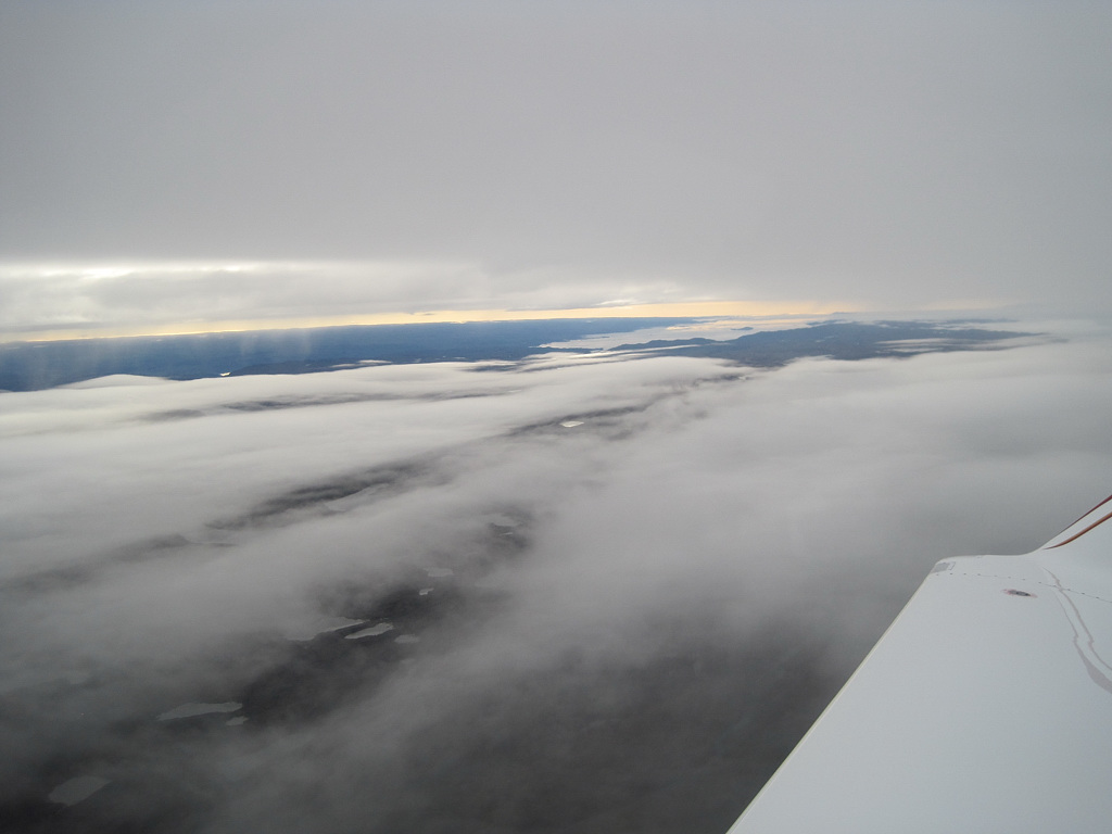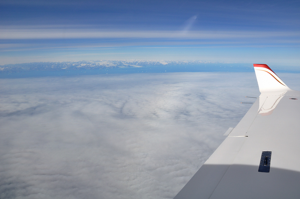 Am Montag geht' früh los, da wir an diesem Tag durch die Zeitverschiebung bis Island 4 Stunden verlieren werden. Wir starten kurz nach 7 Uhr bei tiefliegender Bewölkung und (sher) kühlen Temperaturen. Zuerst schickt uns der Lots auf einem tiefen Flightlevel Richtung Nordwesten. Als wir die Freigabe zum Steigflug erhalten durchbrechen wir die tiefe Wolkenschicht und befinden uns zwischenzeitlich zwischen zwei Wolkenschichten. Der Steigflug geht aber weiter auf FL210, wo wir gute Bedingungen vorfinden und über das Meer Richtung Kangerlussuaq fliegen, welches am Polarkreis in Grönland liegt.