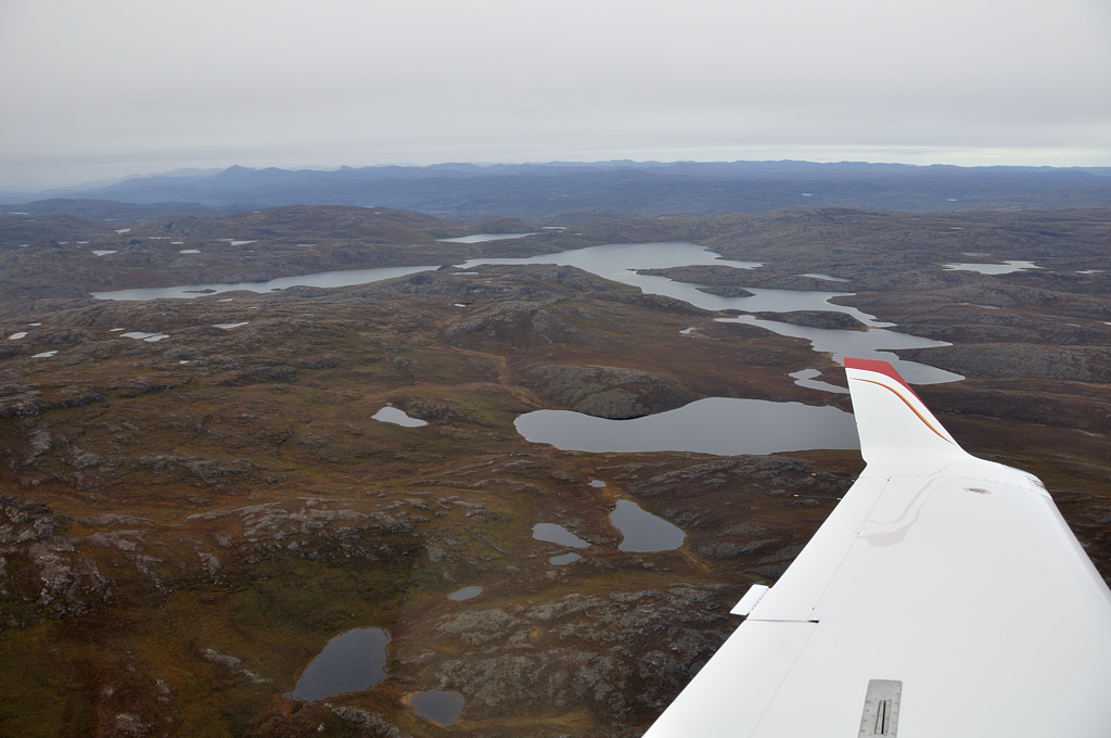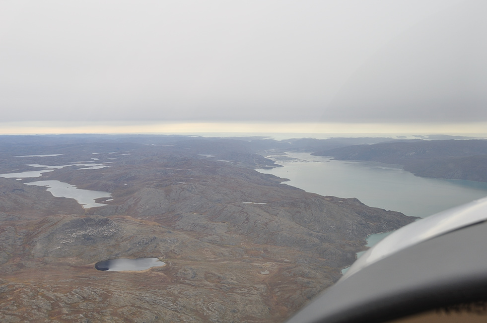 Das Meer ist an Kanadas Küste unter einer Nebeldecke versteckt. Wir haben kaum Wind in unserer Flughöhe und rauschen mit vertretbaren 270 Knoten nach Grönland. Wir erhalten Vektoren zu unserer Zwischenlandung und sinken wiederum unter die Wolken. Wir fliegen eine kurze Zeit dem Søndre Strømfjord entlang. Dieser Fjord ist 200km (!) lang. An dessen ende befindet sich Kangerlussuaq, welches durch seine spezielle Lage fast immer nebelfrei ist.